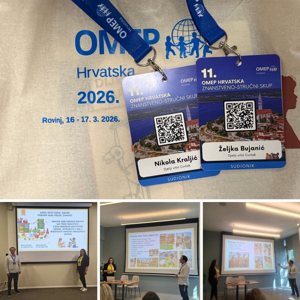 Na znanstveno-stručnom skupu OMEP-a Hrvatske, održanom 16. i 17. ožujka 2026. pod nazivom „Odgoj za mir: kvaliteta odnosa kao temelj promjene“, svoje izlaganje imali su odgojitelji Željka Bujanić i Nikola Kraljića iz Dječjeg vrtića Cvrčak Čakovec, Područnog odjela Pčelice Ivanovec. Njihova tema — „Prostor sobe dnevnog boravka kao treći odgojitelj: STEAM okruženje koje potiče odnose, interakciju i mir u mješovitoj odgojno-obrazovnoj skupini“ — otvorila je važno pitanje uloge prostora u suvremenom ranom i predškolskom odgoju.
